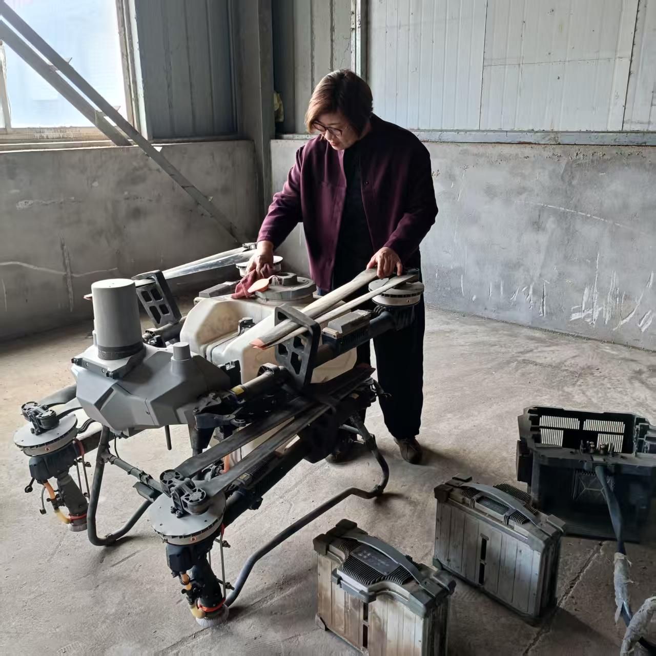 金秋十月,揚(yáng)州市江都區(qū)邵伯鎮(zhèn)南渡村稻浪翻涌。在陸東家庭農(nóng)場(chǎng),區(qū)人大代表、農(nóng)場(chǎng)負(fù)責(zé)人陳家翠剛操控植保無(wú)人機(jī)完成百畝農(nóng)田噴藥作業(yè),便立即投入農(nóng)機(jī)維護(hù),“飛機(jī)一定要擦干,放在通風(fēng)處,防止受潮掉漆?!蹦_上的軍綠膠鞋沾滿(mǎn)泥土,正是一位“種田大戶(hù)”與基層代表的實(shí)干本色的真實(shí)寫(xiě)照。