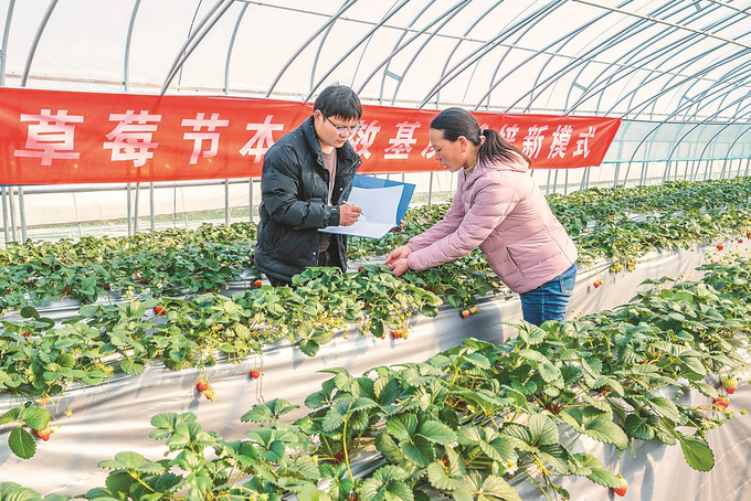 南京國(guó)家農(nóng)高區(qū)芃泰種業(yè)科技有限公司采用智慧科技培育的新品種草莓“金陵紅”長(zhǎng)勢(shì)喜人,技術(shù)人員正在記錄種業(yè)草莓種植相關(guān)數(shù)據(jù)。 朱紅生 攝 (視覺(jué)江蘇網(wǎng)供圖)