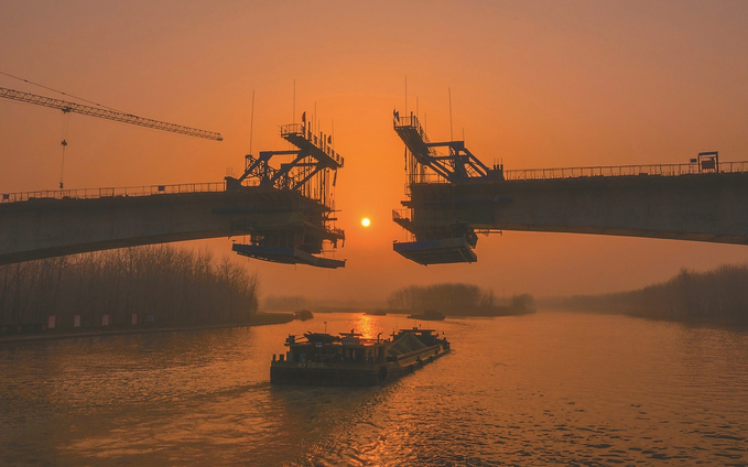 宿遷市宿豫區(qū)仰化鎮(zhèn)268省道京杭大運(yùn)河特大橋施工現(xiàn)場(chǎng)熱火朝天,工人們正在緊張快干,按序時(shí)進(jìn)度施工,確保主體橋面如期合龍。 張連華 攝 (視覺(jué)江蘇網(wǎng)供圖)