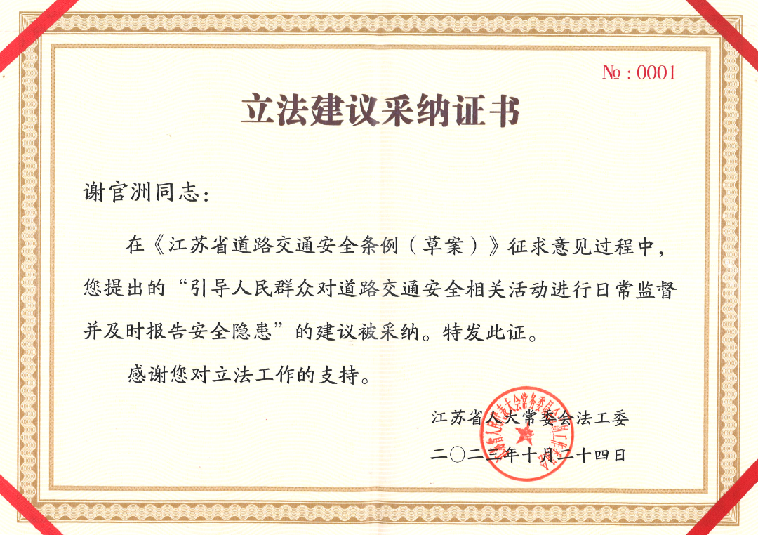 2023年10月起,省人大常委會(huì)也開始頒發(fā)立法建議采納證書。0001—0005號(hào)證書被頒給在《江蘇省道路交通安全條例》立法中作出貢獻(xiàn)的三位個(gè)人、兩個(gè)機(jī)構(gòu)?!白鳛橐幻胀ㄈ罕?,我提出的建議能被立法機(jī)關(guān)采納,感到很受鼓舞?!?001號(hào)立法建議采納證書獲得者謝官洲說,他雖然不是法律從業(yè)人員,但作為公民有參與立法的權(quán)利。“履行自己應(yīng)盡的義務(wù),不是和吃飯喝水一樣普通嘛?!?/p>