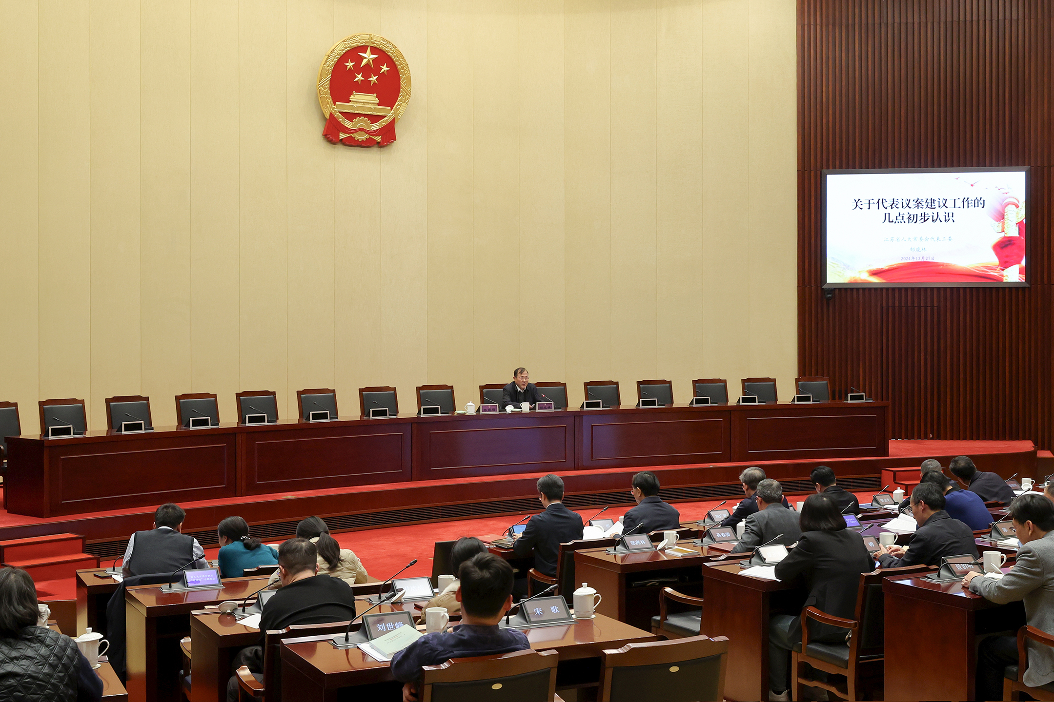 郜虎林從堅(jiān)持和完善人民代表大會制度,踐行全過程人民民主的高度,闡述了人大代表議案建議的內(nèi)涵、性質(zhì)和相關(guān)制度機(jī)制的建立發(fā)展,介紹了省人大代表議案建議工作現(xiàn)狀,按照“內(nèi)容高質(zhì)量、辦理高質(zhì)量”和“既要重結(jié)果、也要重過程”要求,從提、交、辦、督、評五個(gè)環(huán)節(jié),提出了進(jìn)一步提高代表議案建議工作質(zhì)效的思路舉措,對省人大機(jī)關(guān)如何協(xié)同做好代表議案建議工作談了深刻認(rèn)識。