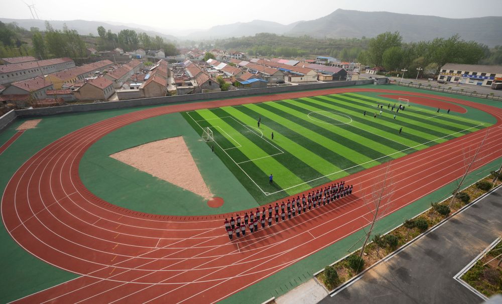 ??在位于山東濰坊市臨朐縣石家河村的臨朐縣彌水教育集團(tuán)石家河校區(qū),學(xué)生在操場(chǎng)塑膠跑道上進(jìn)行體育鍛煉(2025年4月17日攝)。新華社記者 徐速繪 攝